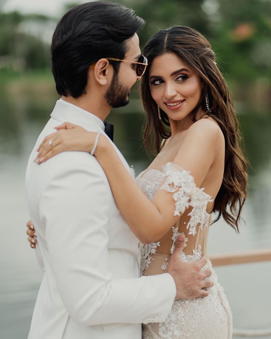 This bride who chose a fabulous bodycon gown in white and nude hues