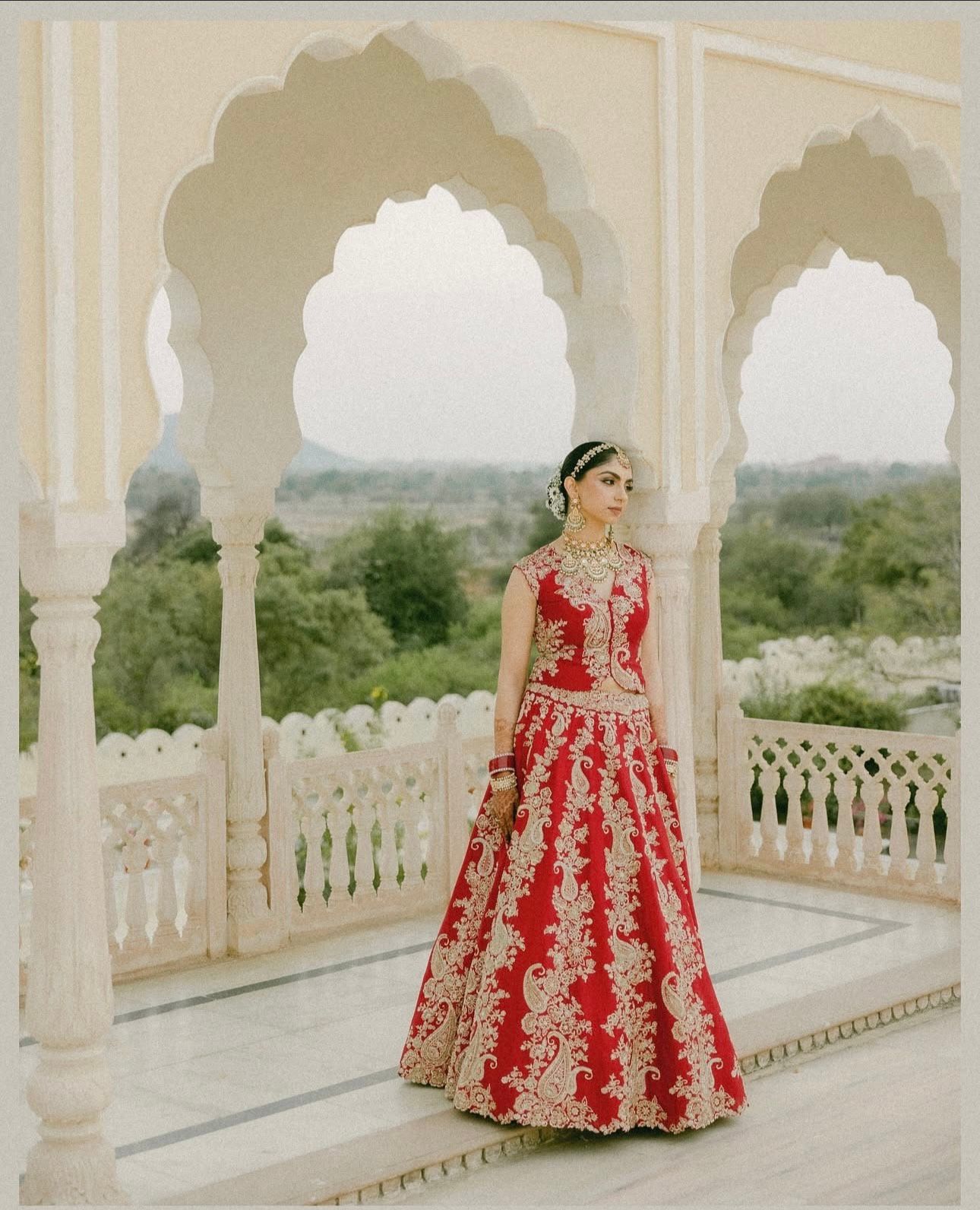 This bride gave her traditional red lehenga a fierce twist by pairing it with a matching waistcoat—blending timeless elegance with bold, modern charm. Now that’s how you make a statement!