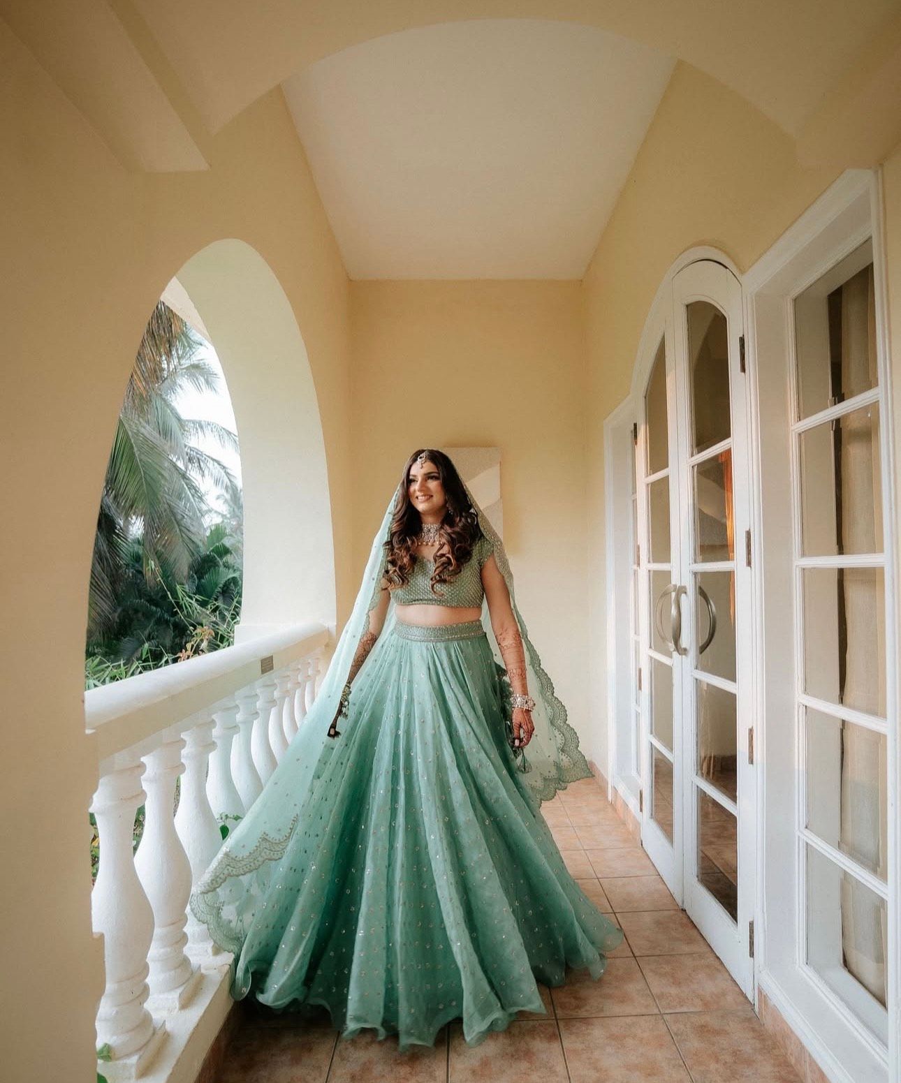 Real bride Rhea, who is a designer herself got inspired by her wedding venue to design her bridal lehenga! She picked sunset and beachy hues, which popped on her ivory and beige lehenga, and we love the look she rocked with it- some heirloom jewellery, nude makeup and a simple bridal look which we loved.