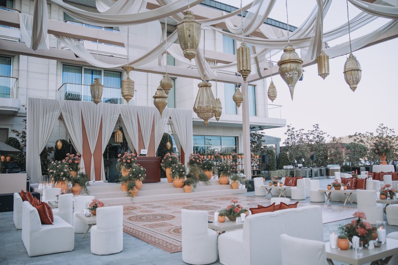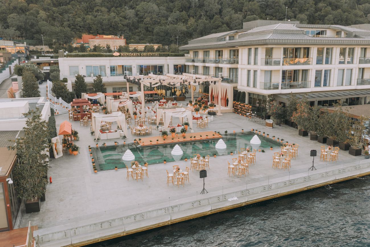 Set against the shimmering Bosphorus, the Sangeet was nothing short of magical. Guests arrived by boat to a Moroccan-inspired setting complete with draped tents, canopied lounges, and desert florals.