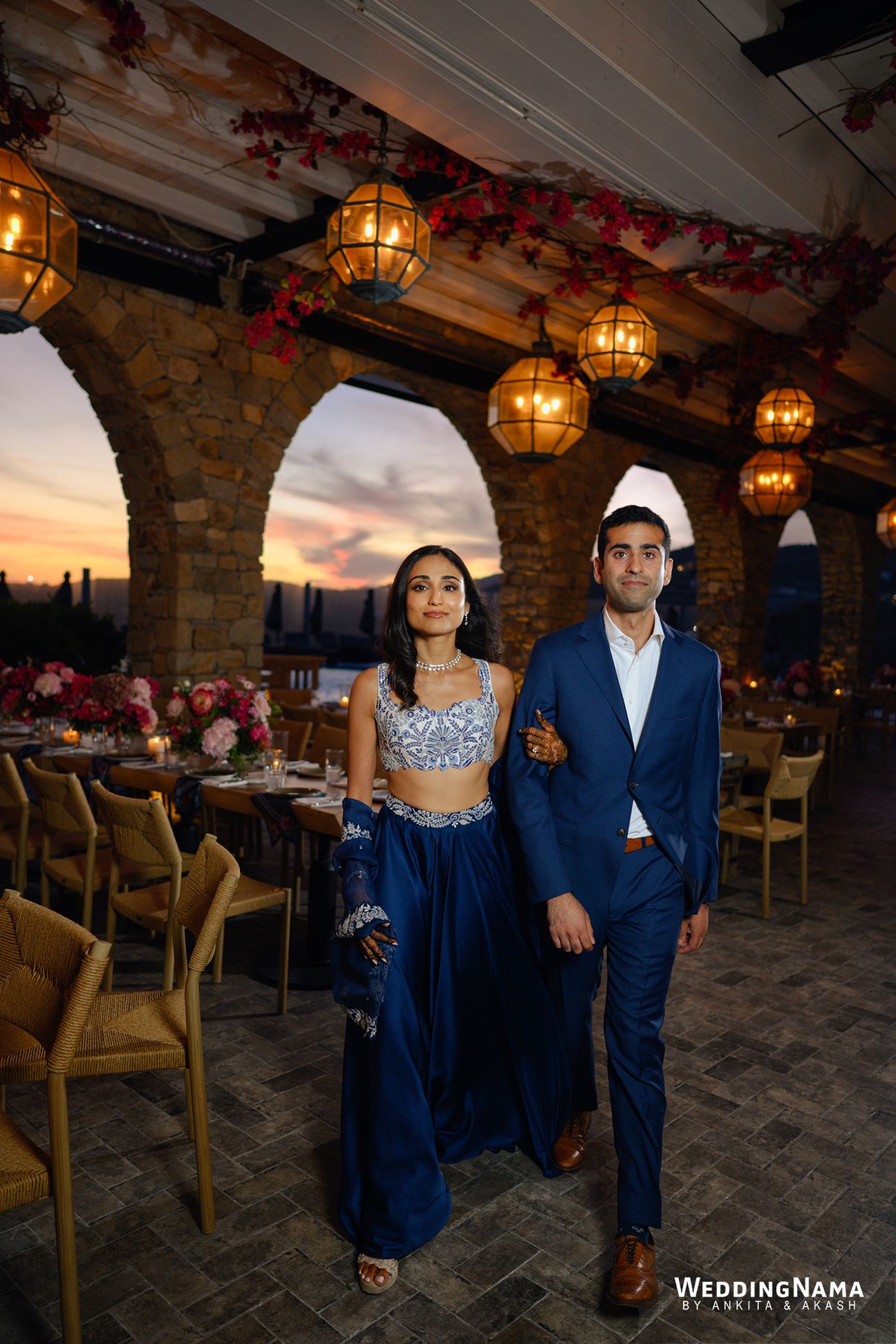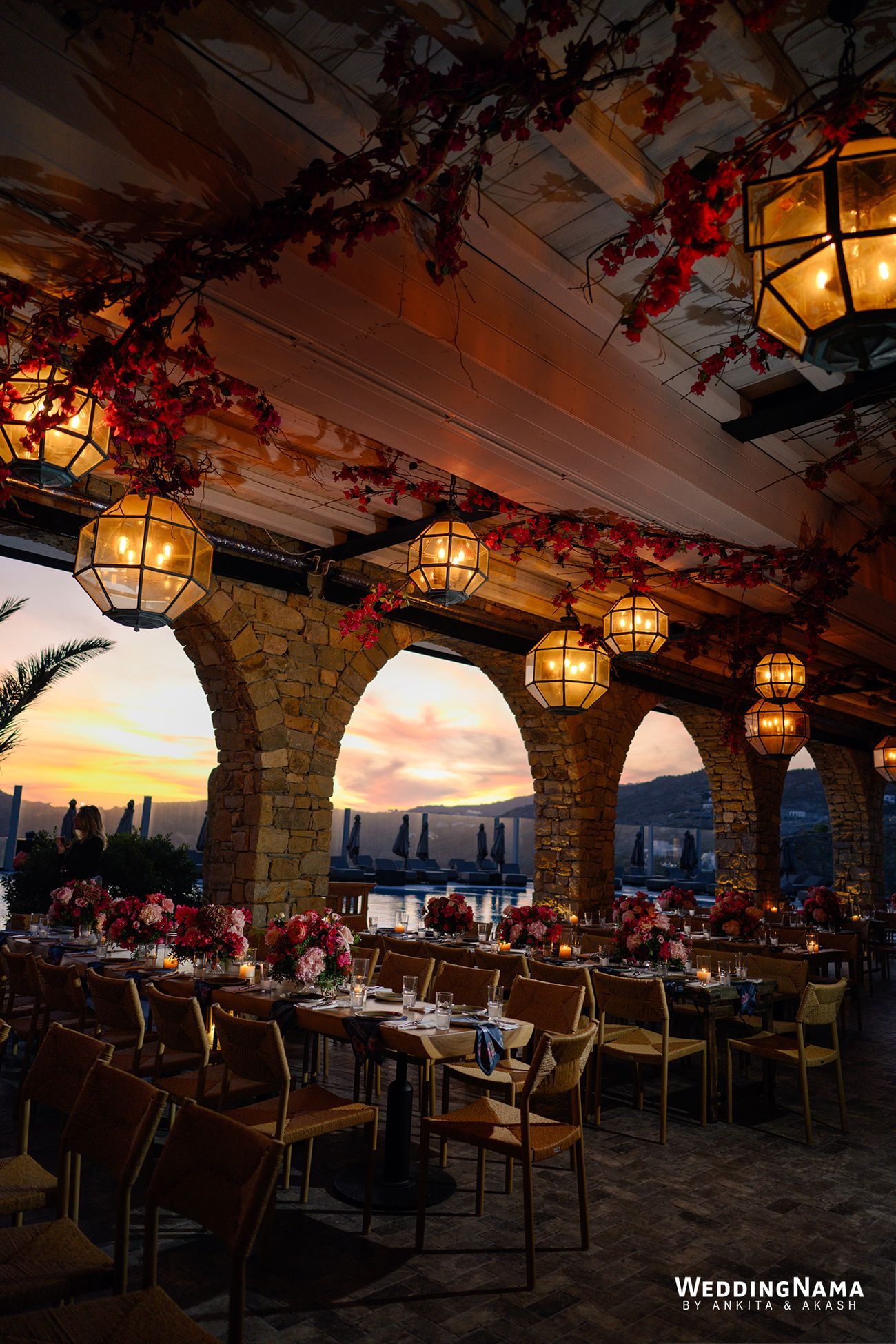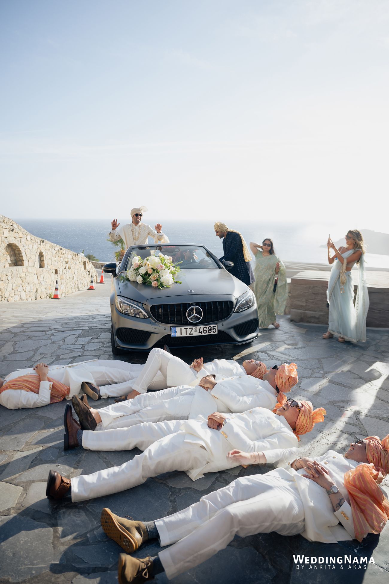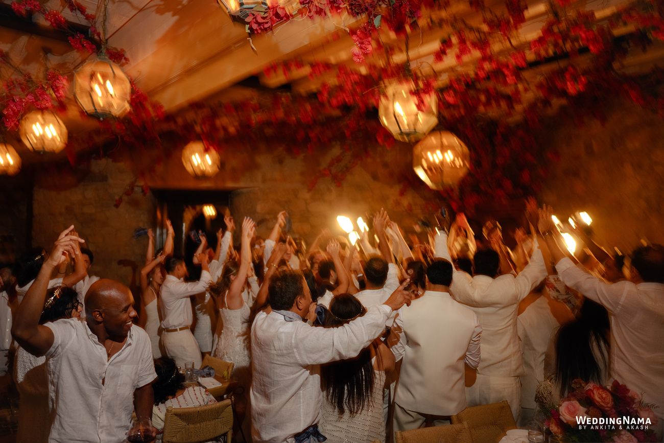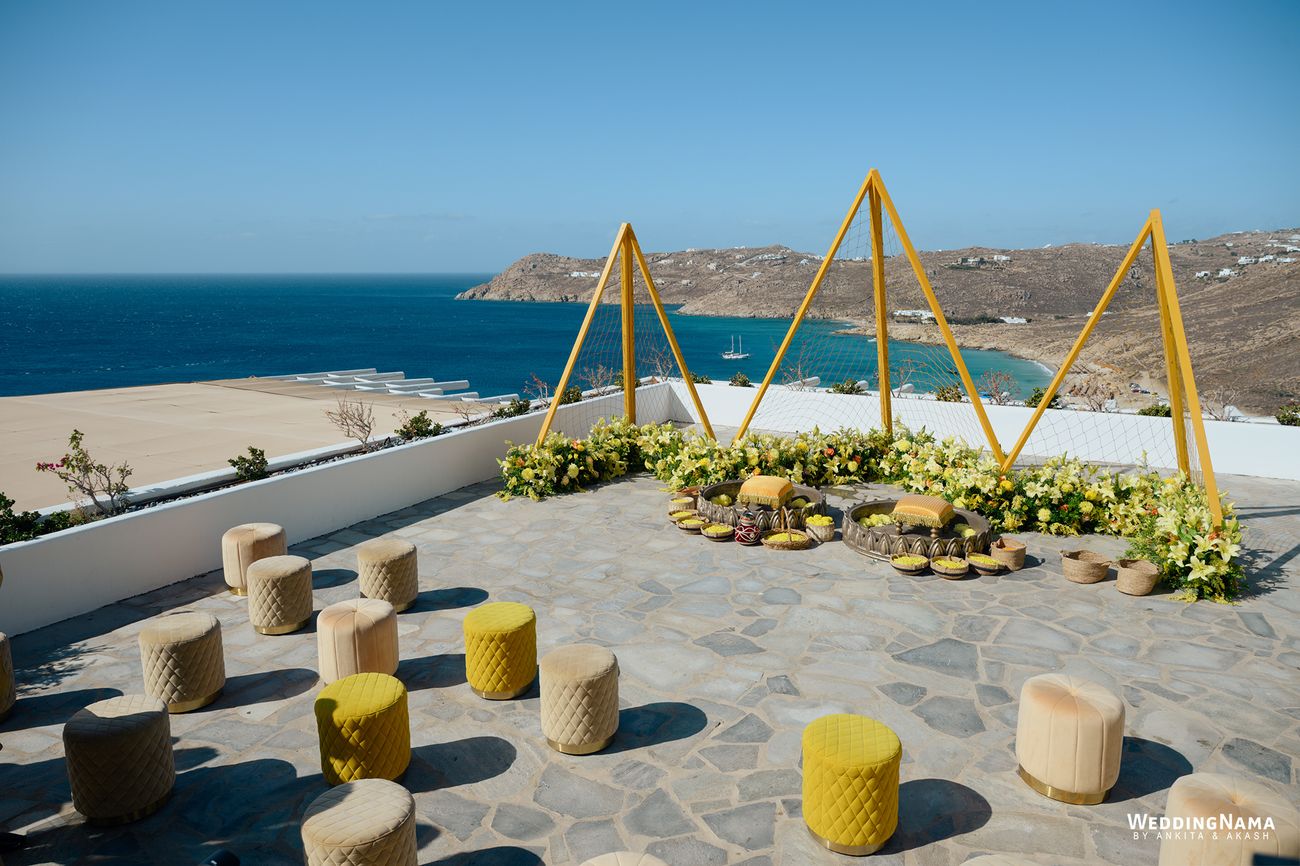 Opposites in the best way, with Nikita’s bold, extroverted energy balancing Rishi’s calm, thoughtful presence, their celebrations unfolded as a beautiful blend of emotion, fun, and effortless island luxury. The festivities kicked off with a Greek-inspired White Party welcome dinner complete with live music, plate smashing, and dancing under the stars. A vibrant, sun-soaked Mehendi followed, where traditional Indian elements met coastal Mykonos tones, while the Sangeet turned into a magical night under fairy lights, with the couple’s initials projected onto the mountains behind the stage. The Haldi was intimate and joyful, bathed in marigold hues and Mediterranean sunshine, before the wedding day arrived in all its glory. A high-energy baraat set the tone, leading into an emotional sunset ceremony overlooking the Aegean Sea, where Nikita and Rishi exchanged vows under a glowing sky. The celebrations flowed seamlessly into golden-hour cocktails and a candlelit reception filled with heartfelt speeches, laughter, and dancing late into the night—wrapping up a wedding that felt deeply personal, visually stunning, and full of soul.