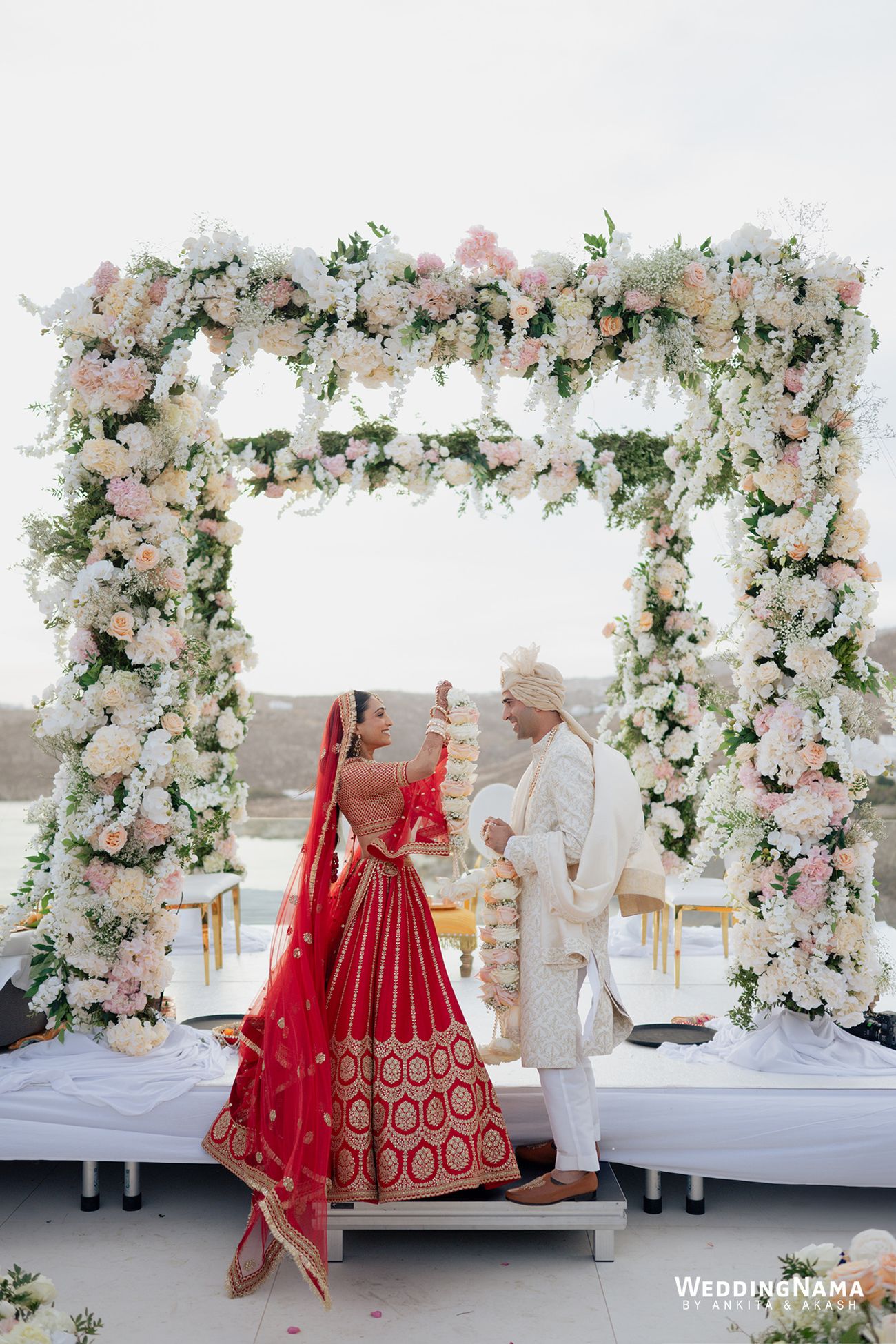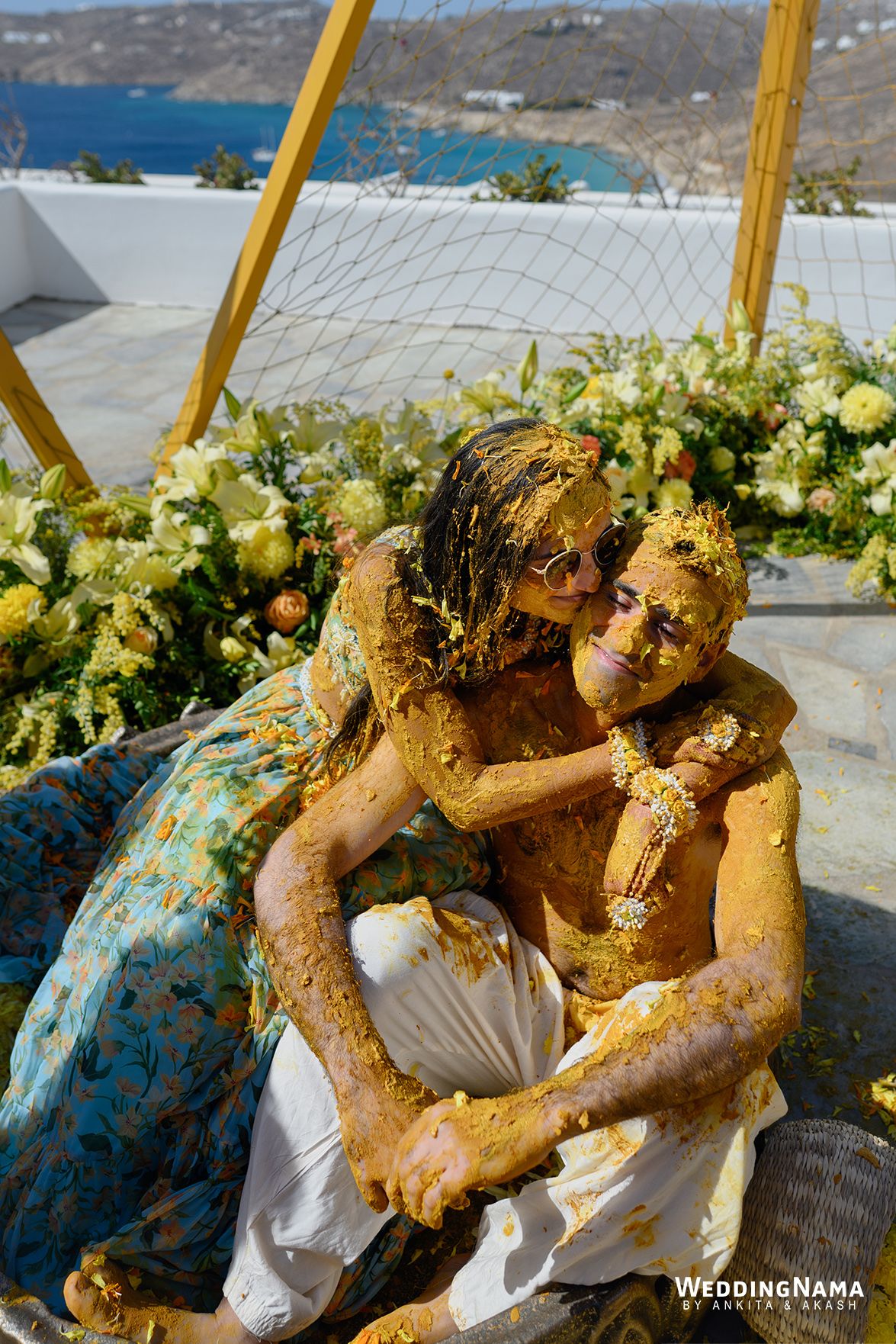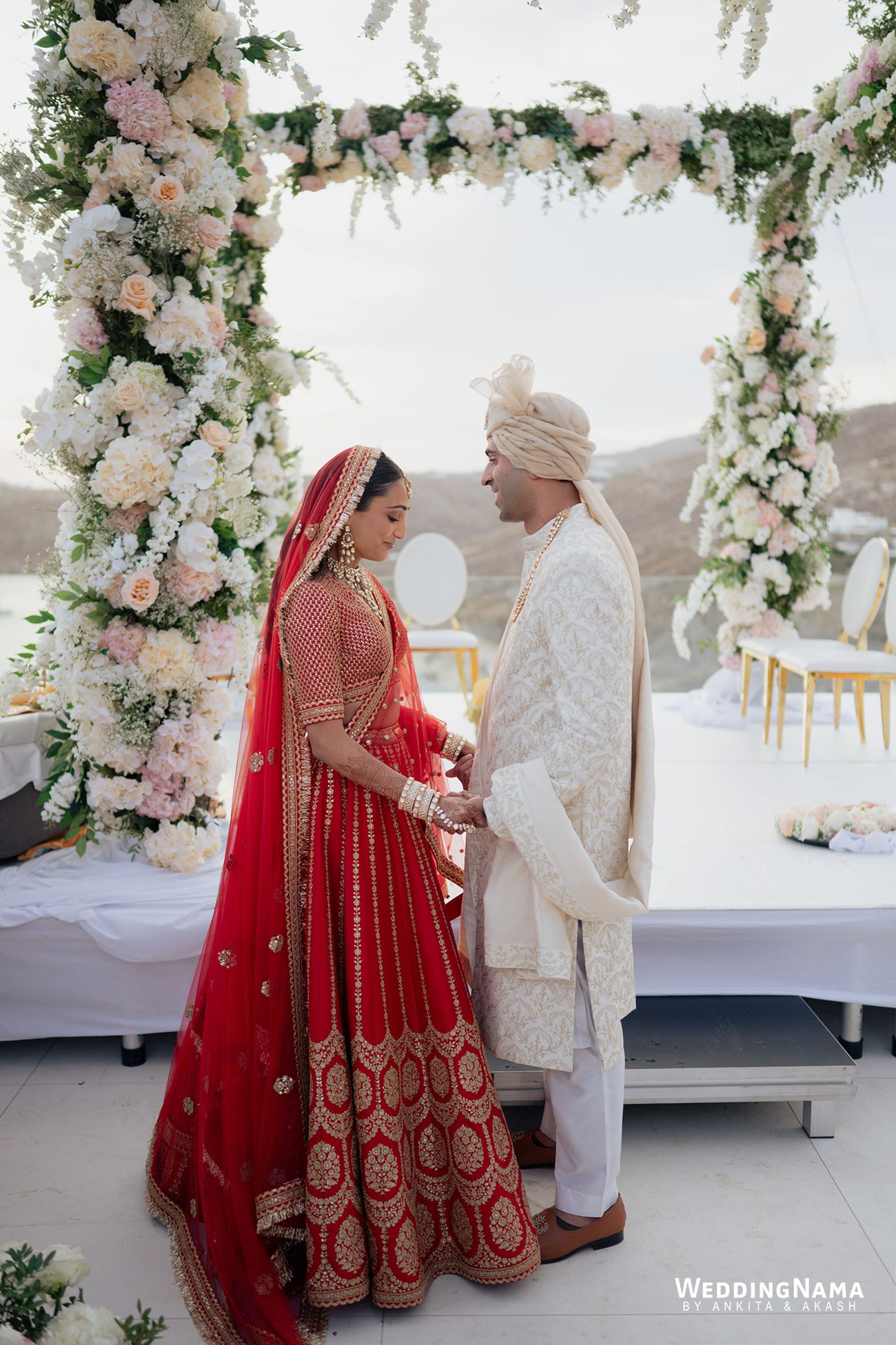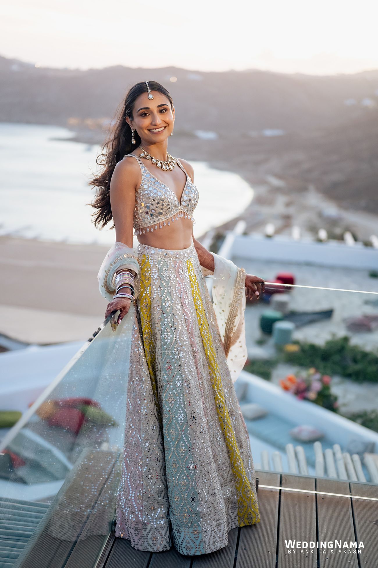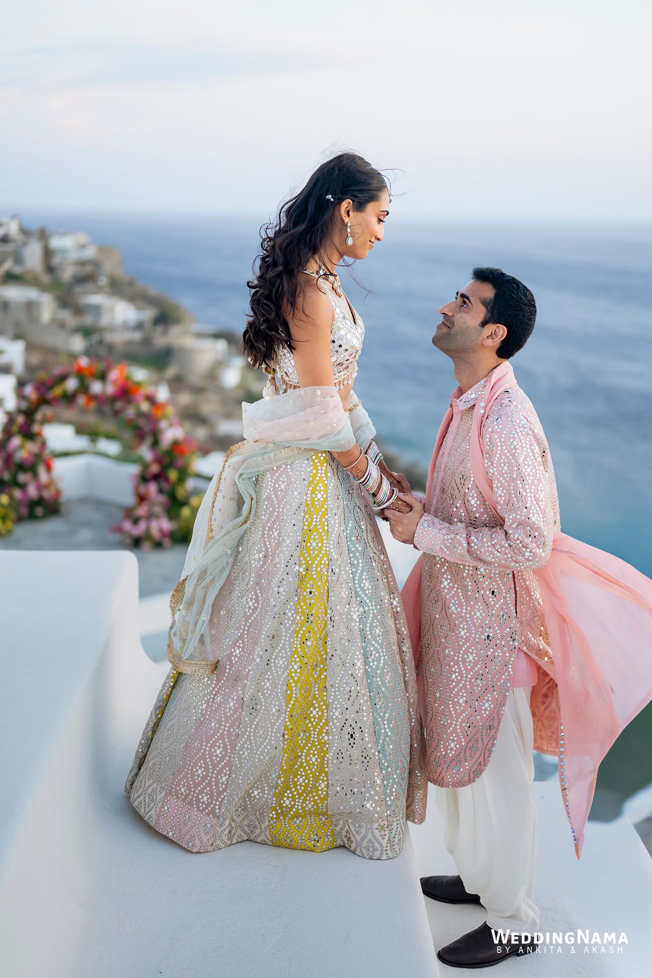 Vendors: Photography & Films: WeddingNama | Wedding Planning: Naido Weddings | Venue: Royal Myconian | Florals & Décor: Jim Labraco | Sound & Lighting: Sound Mykonos We Entertain | Makeup & Hair: Meera MUA | Outfits: Alexandra Miro (Pre wedding), Gopi Vaid (Sangeet and Mehendi), Simone Handcrafted (Welcome Dinner), Archana Kochhar (Mehendi), Manisha Soni (Haldi), Sabyasachi Mukherjee (Wedding & Reception), Retrofête (After Party)