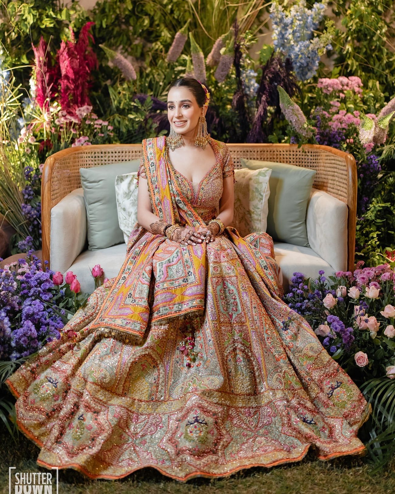 Clad in this sunshining lehenga sprinkled with hints of pink, blue and green, this bride made for a gorgeous bride on her Mehendi.