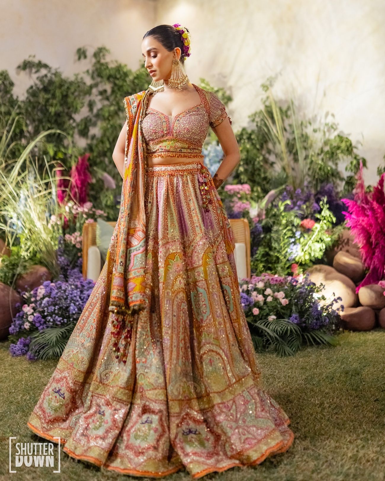 Isn’t bride Bhavika’s mehendi lehenga a kaleidoscope of colors and so effortlessly chic? But what stole the show for us was that quirky hair accessory, adding an easy-breezy charm to her look!