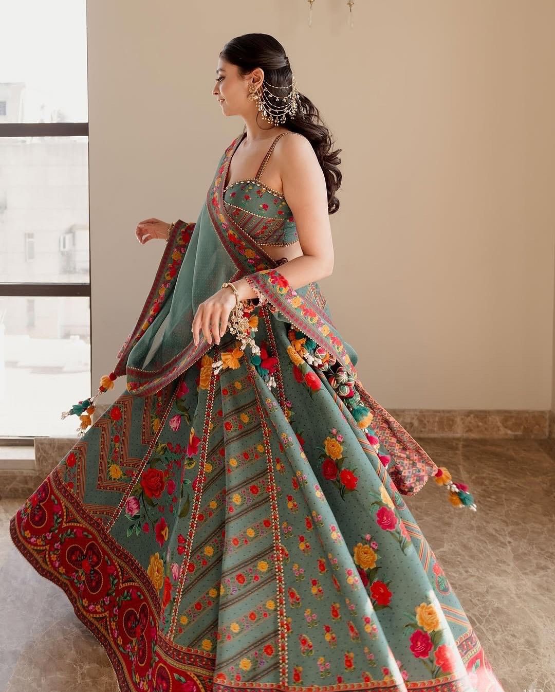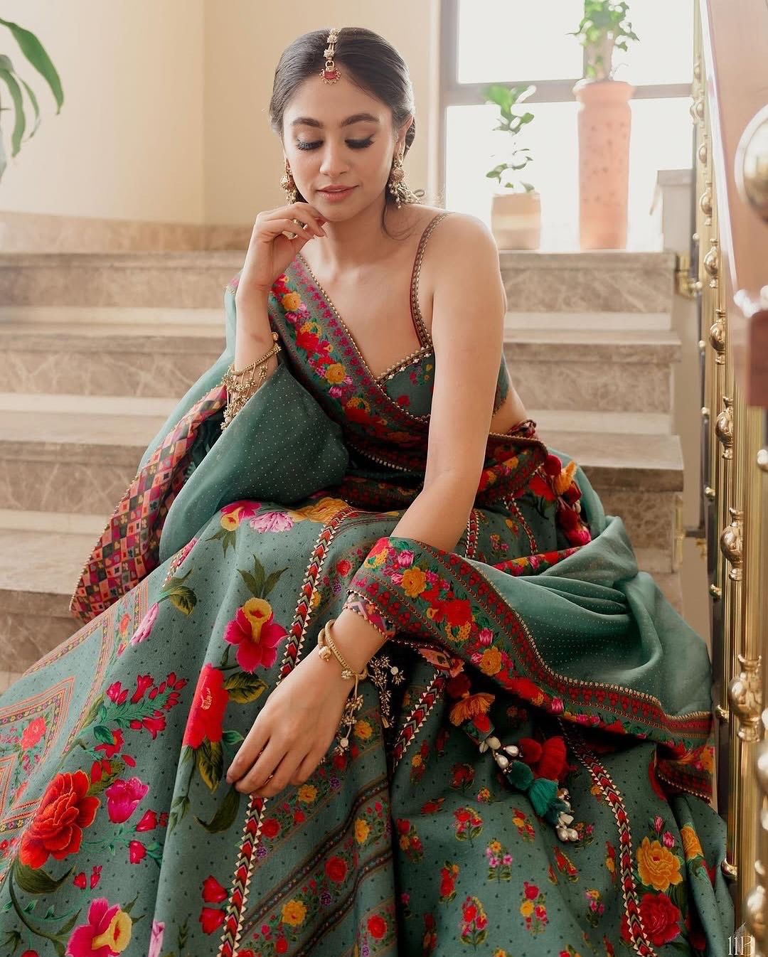 Keep in sync with all the festive vibes by wearing something as colourful as this lehenga on your mehendi. PS. You can even throw some multi-coloured baubles to it to take your look a notch above.