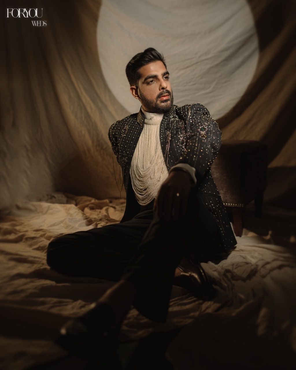This groom picked a pearl fringe detailing for his look with a studded jacket. So out of the box!