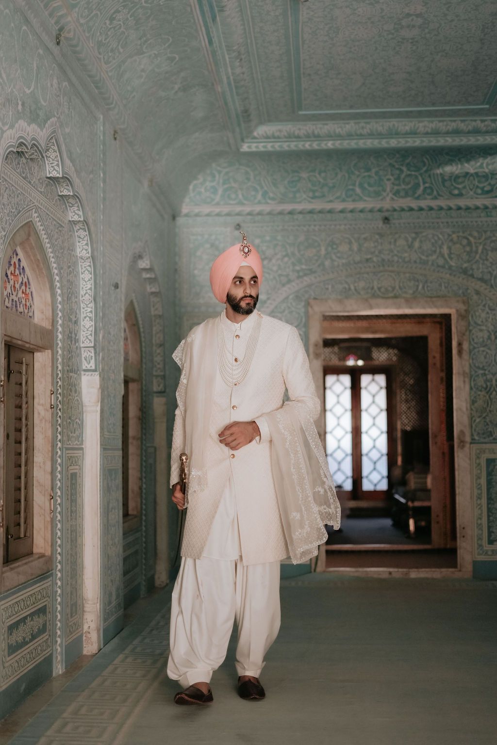 There is something ethereal and classic about a groom in a white sherwani and pink safa. This groom added his own swag with a chikankari stole to match the bride and pearl jewellery!