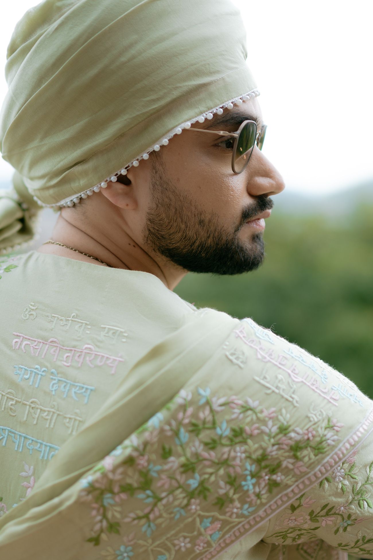 One of our favourite-est looks of the year, this dreamy sage green sherwani with delicate zardozi and threadwork on it. And that matching organza safa – total love!