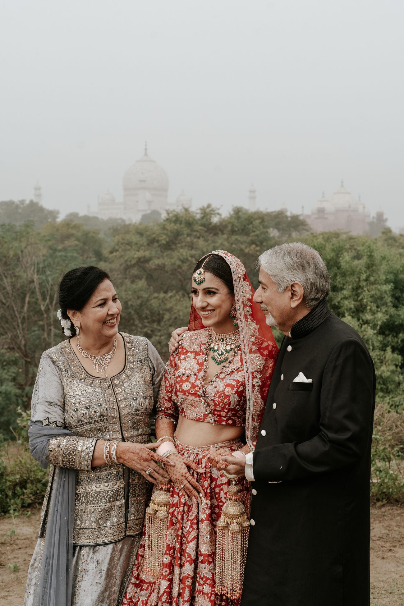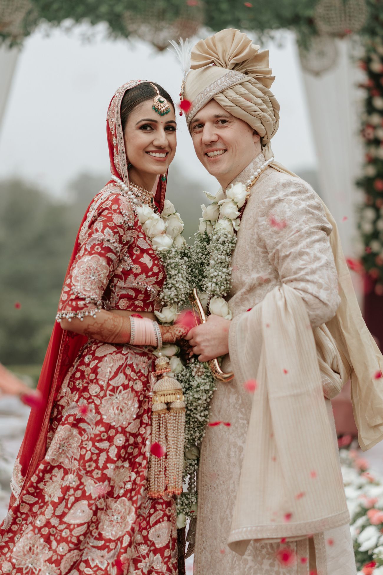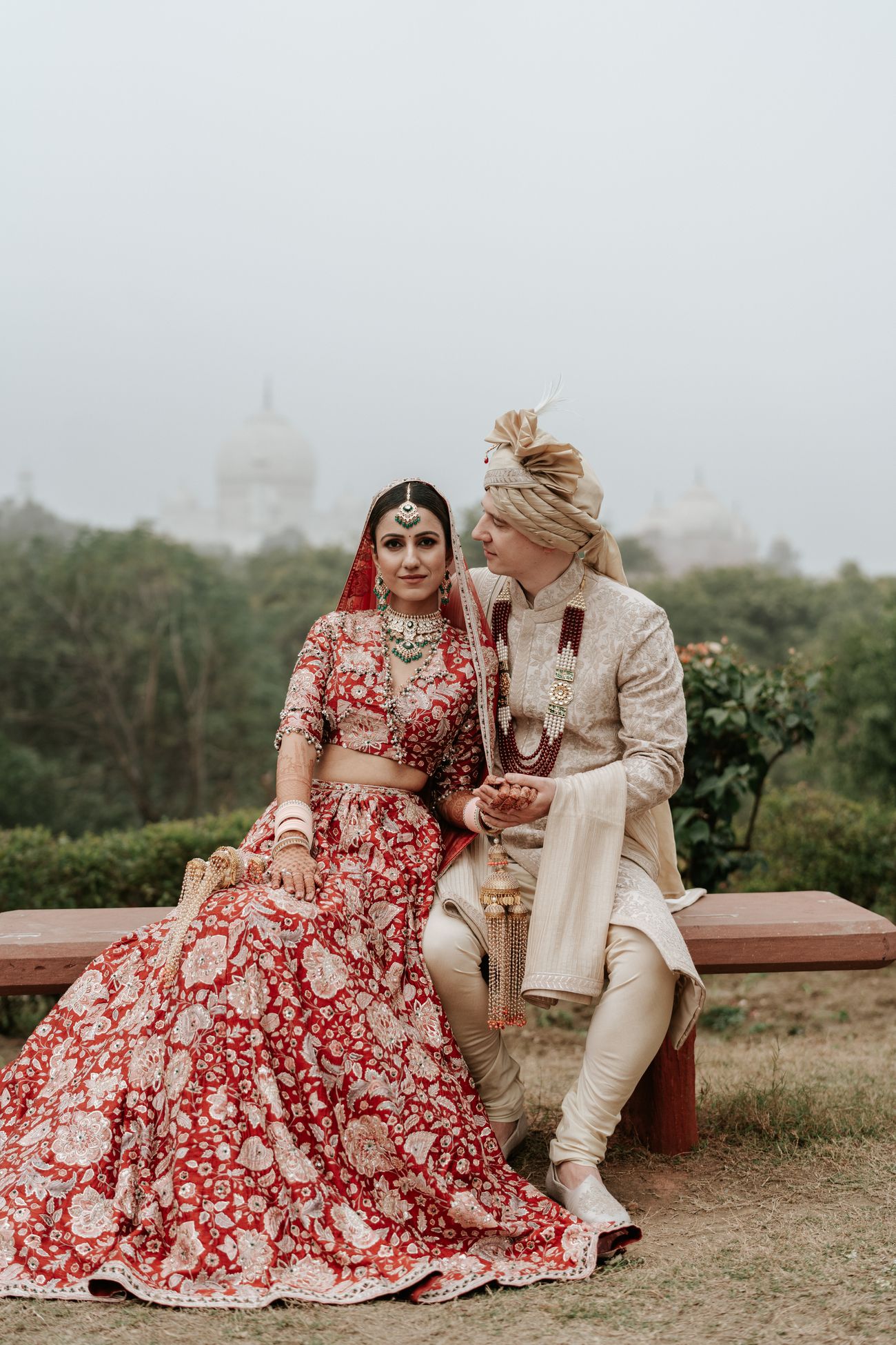 Our wedding took place on January 5, 2024. We had a wedding that I had dreamt of since I was 18 - a ceremony with the Taj Mahal in the backdrop. As a young girl, when I visited Hotel Taj Khema (a government property next to the Taj Mahal) for an event, I decided that I would like to get married there if I married for love. Four years ago, I met Patrick while pursuing my Masters at Stanford University. He brought immense happiness and peace to my life, and I knew soon that he was the one. A year ago, when we decided to get married, I took him to see the Taj Mahal and Hotel Taj Khema. He approved of my choice immediately! I always wanted to have a red wedding lehenga for my pheras, however, I did not want to be a traditional bride. I wanted to be a fun and sassy bride. After scouring through several designer stores in Delhi, I came across my wedding dress at Ridhi Mehra’s Mehrauli store. Again, it was love at first sight. The pockets in the skirt were a cherry on top. As soon as I tried on the dress, it made me feel sassy yet graceful - exactly how I wanted to feel. I added a 15-foot long veil to add a bit of drama to my bridal entry. My amazing bridesmaids held my veil and walked by my side as I walked towards the love of my life. Our wedding, like all weddings, was a lot of work. However, an additional ounce of work involved in our cross-border wedding was receiving all our international guests. Patrick and I planned each event with all our love and enthusiasm, and the result was dreamy.