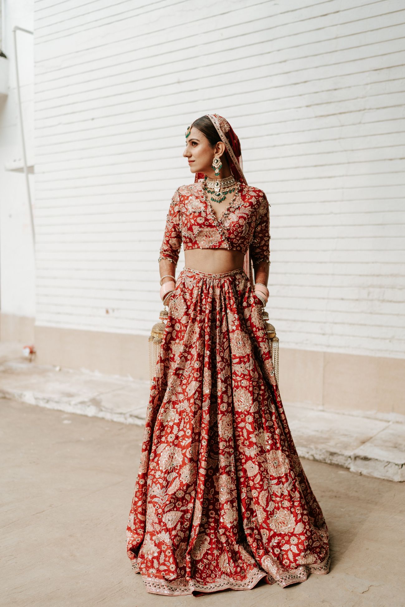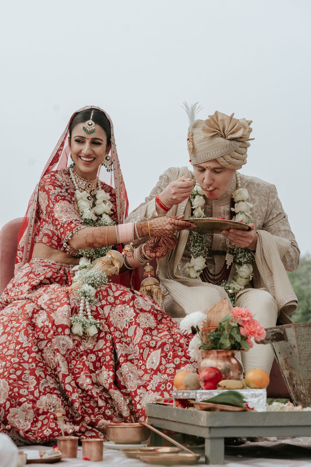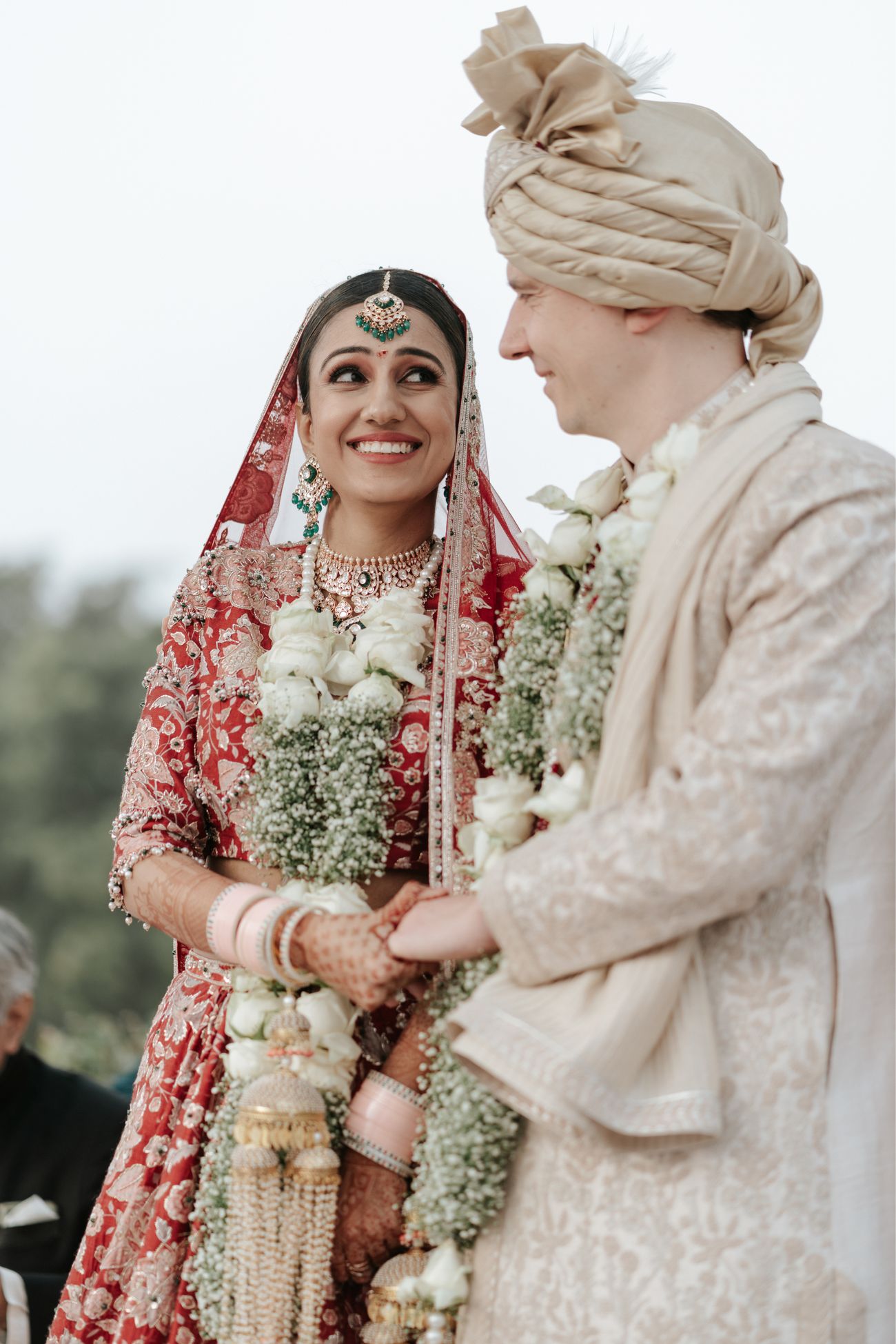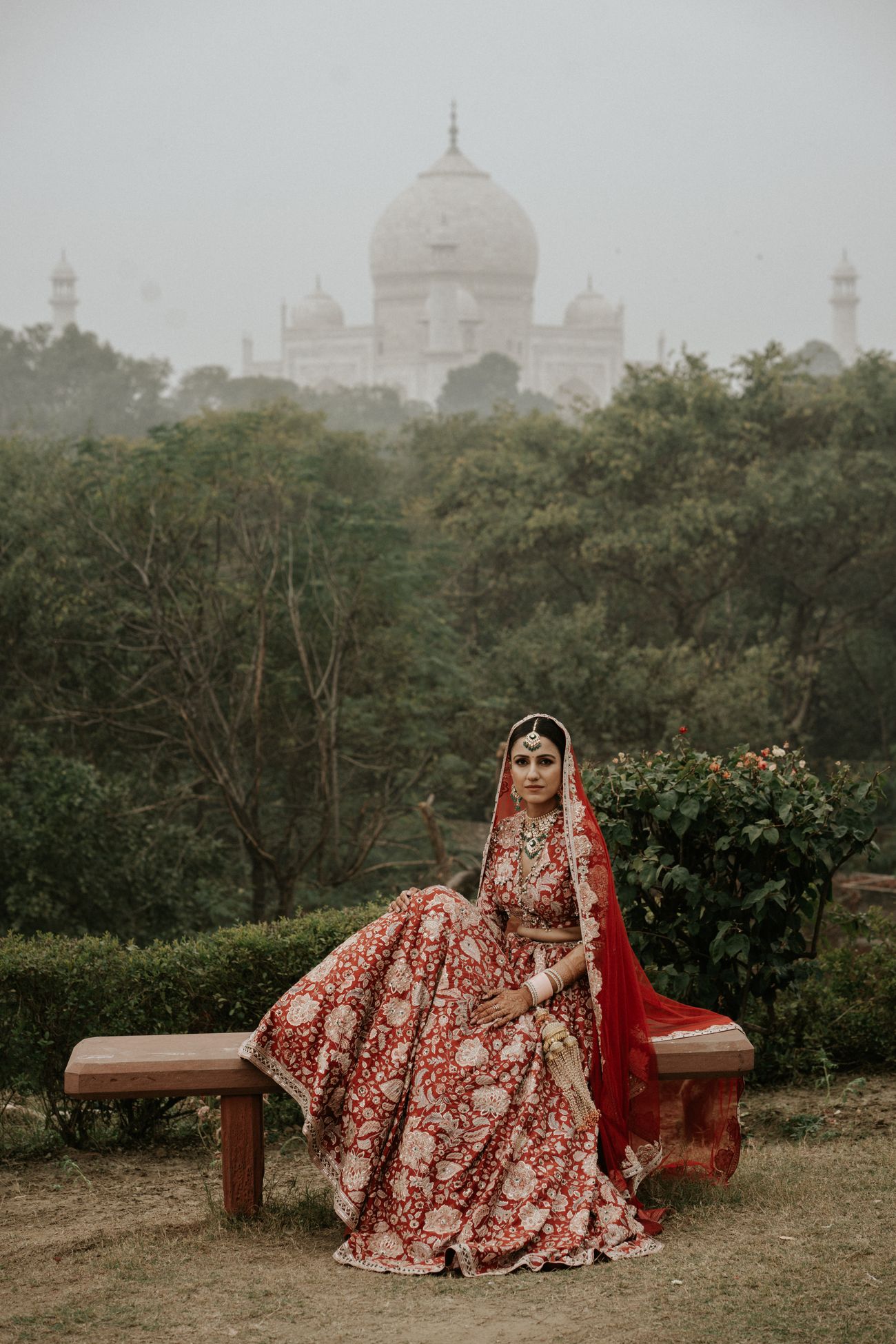 Our wedding took place on January 5, 2024. We had a wedding that I had dreamt of since I was 18 - a ceremony with the Taj Mahal in the backdrop. As a young girl, when I visited Hotel Taj Khema (a government property next to the Taj Mahal) for an event, I decided that I would like to get married there if I married for love. Four years ago, I met Patrick while pursuing my Masters at Stanford University. He brought immense happiness and peace to my life, and I knew soon that he was the one. A year ago, when we decided to get married, I took him to see the Taj Mahal and Hotel Taj Khema. He approved of my choice immediately! I always wanted to have a red wedding lehenga for my pheras, however, I did not want to be a traditional bride. I wanted to be a fun and sassy bride. After scouring through several designer stores in Delhi, I came across my wedding dress at Ridhi Mehra’s Mehrauli store. Again, it was love at first sight. The pockets in the skirt were a cherry on top. As soon as I tried on the dress, it made me feel sassy yet graceful - exactly how I wanted to feel. I added a 15-foot long veil to add a bit of drama to my bridal entry. My amazing bridesmaids held my veil and walked by my side as I walked towards the love of my life. Our wedding, like all weddings, was a lot of work. However, an additional ounce of work involved in our cross-border wedding was receiving all our international guests. Patrick and I planned each event with all our love and enthusiasm, and the result was dreamy.
