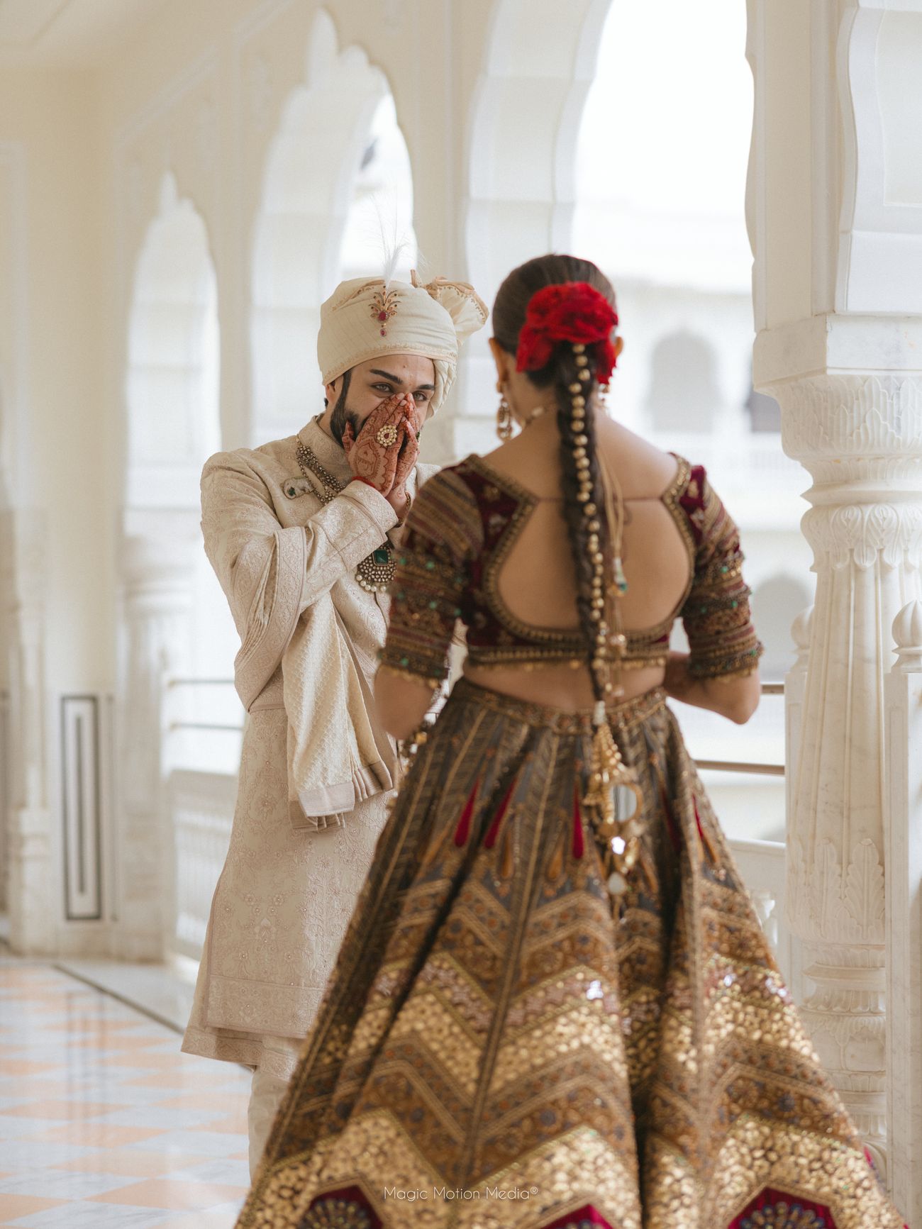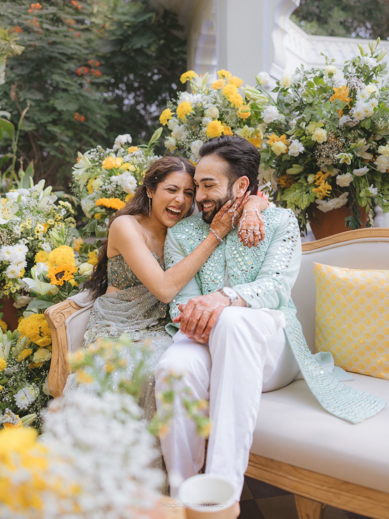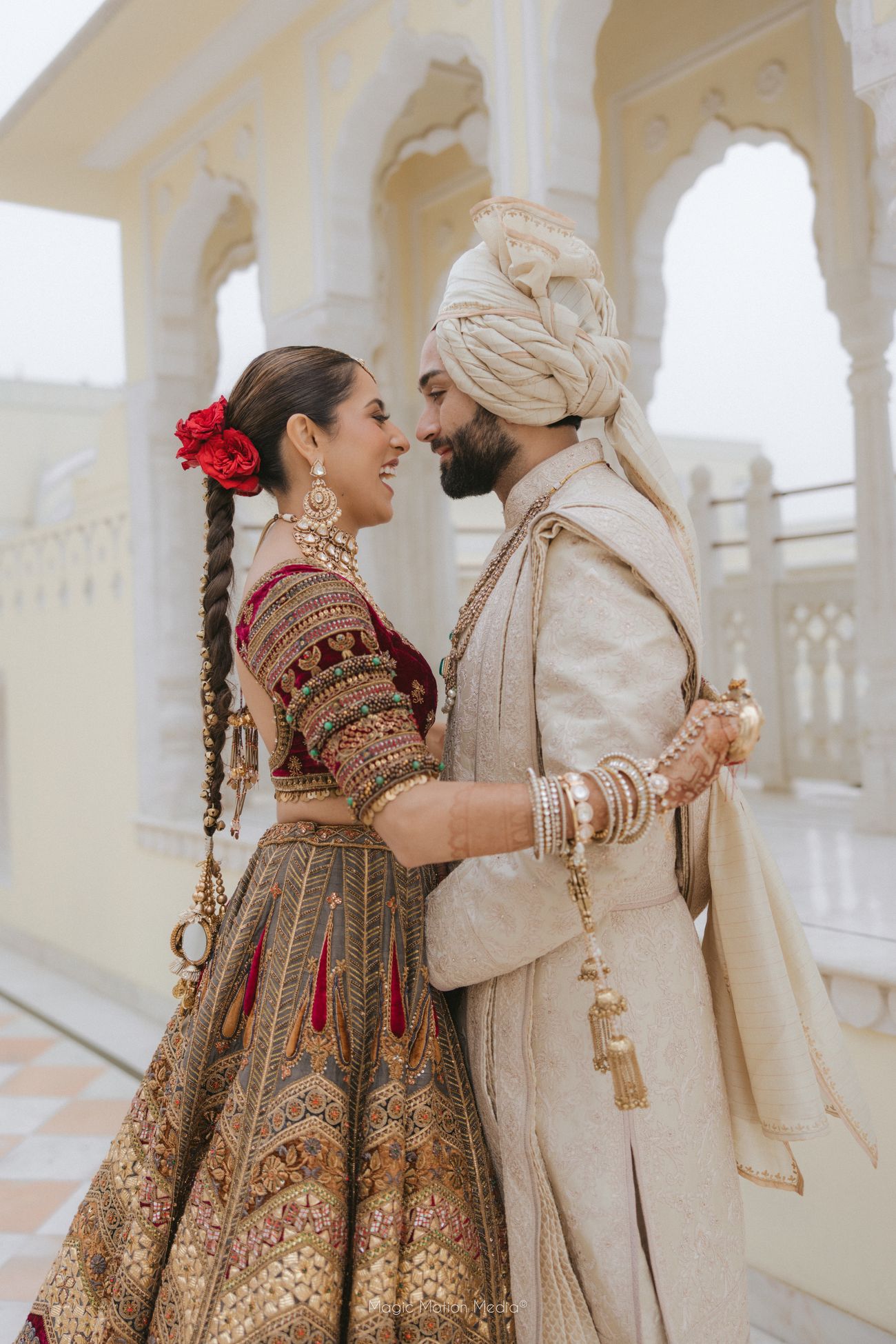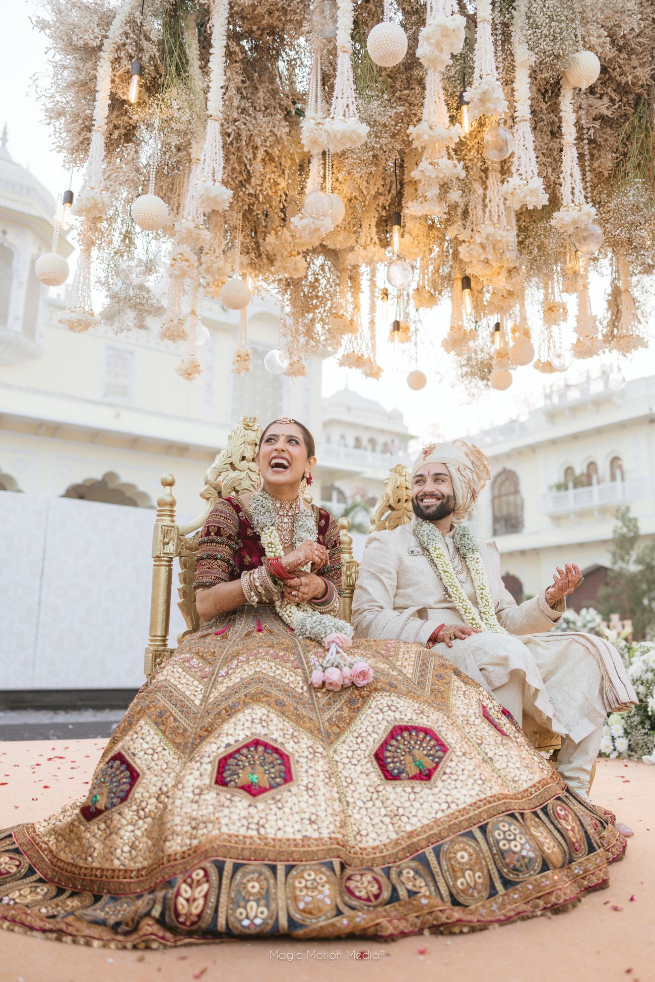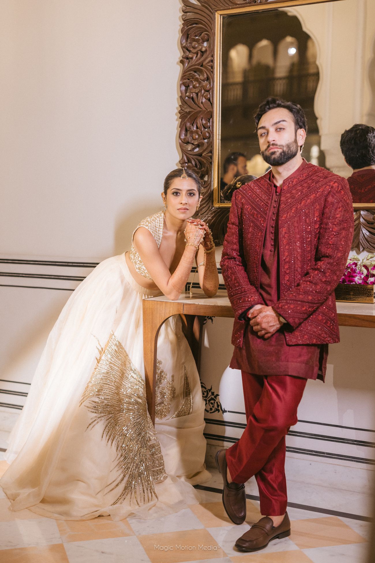 Vendors: Venue: Hyatt Regency Jaipur Mansarovar | Makeup Artist: Gild By Vinnie Kapoor for all events and Mua Swati Rohila for Mehendi| Wedding Planning and Decor: F5 Weddings | Photography: Magic Motion Media | Bridal Outfits: Mehendi: ITRH, Haldi: Dolly J Bridal Collection , Garba: Frenyz Couture, Sangeet: House of Masaba , Wedding: Marwar Couture , Reception: Rahul Mishra | Groomwear: Haldi: Ankur J , Garba: Frenyz Couture, Sangeet: Stitch by Sarab Khanijou , Wedding: Tarun Tahiliani , Reception: Rohit Bal |