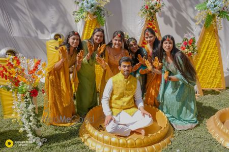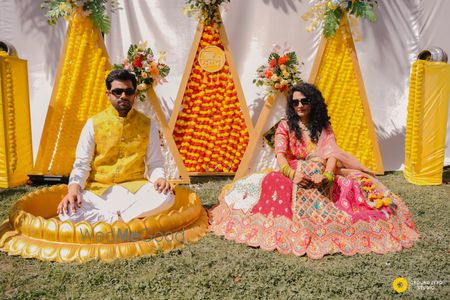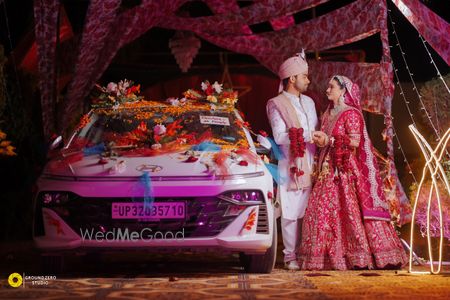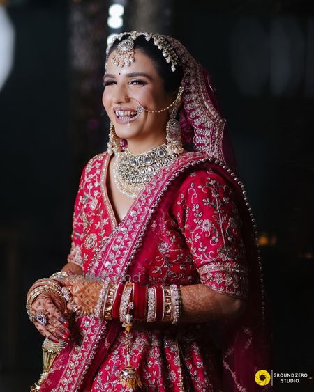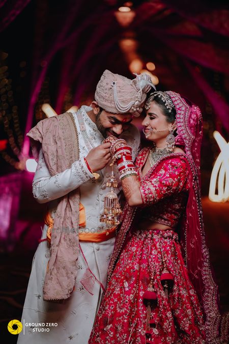 This stunning couple radiates elegance and joy in their traditional wedding attire. The groom is dashing in a white sherwani adorned with intricate embroidery, complemented by a pastel turban and a matching dupatta draped gracefully over his shoulder. The bride is a vision in a vibrant red lehenga, richly decorated with gold and floral patterns, paired with elaborate jewelry that highlights her radiant smile. Together, they exude a perfect harmony of love and tradition, making them a truly beaut