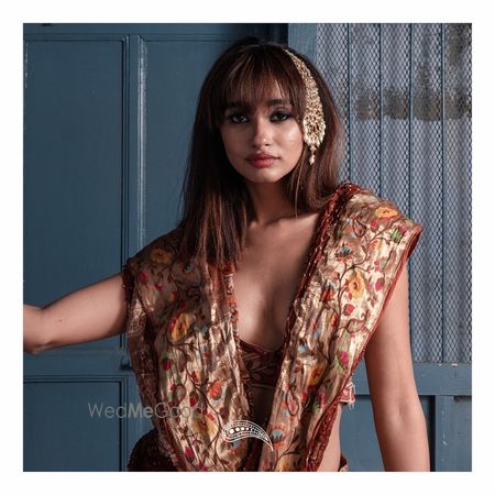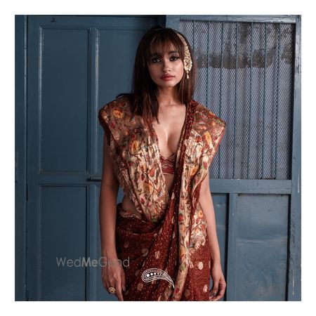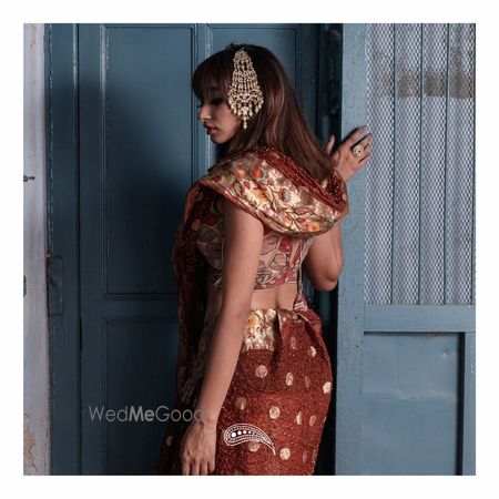 Kota doriya saree in chocolate brown color with signature bharti bandhej. It has beautifully weaved golden zari border