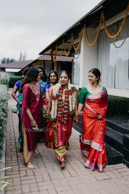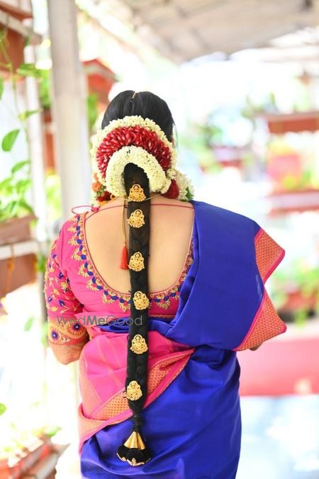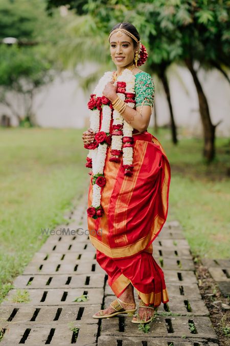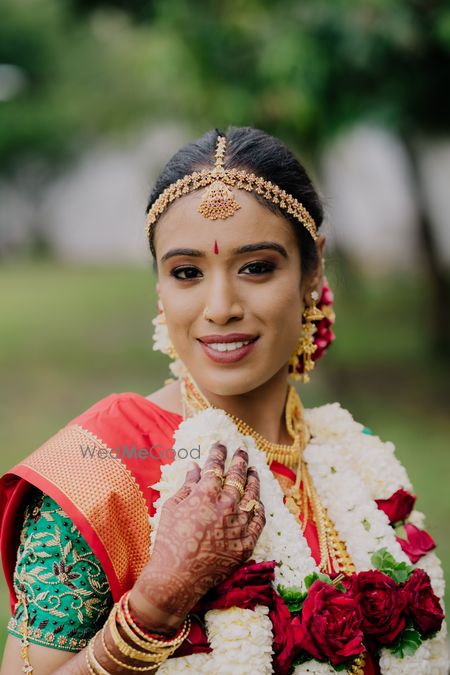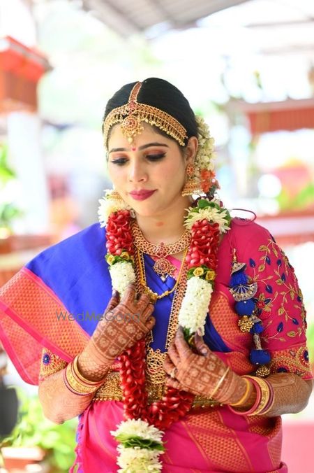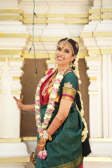 Beautiful makeover and perfect hairdo for Muhurtham for the pretty bride in the nine yard sari for Tamil wedding!